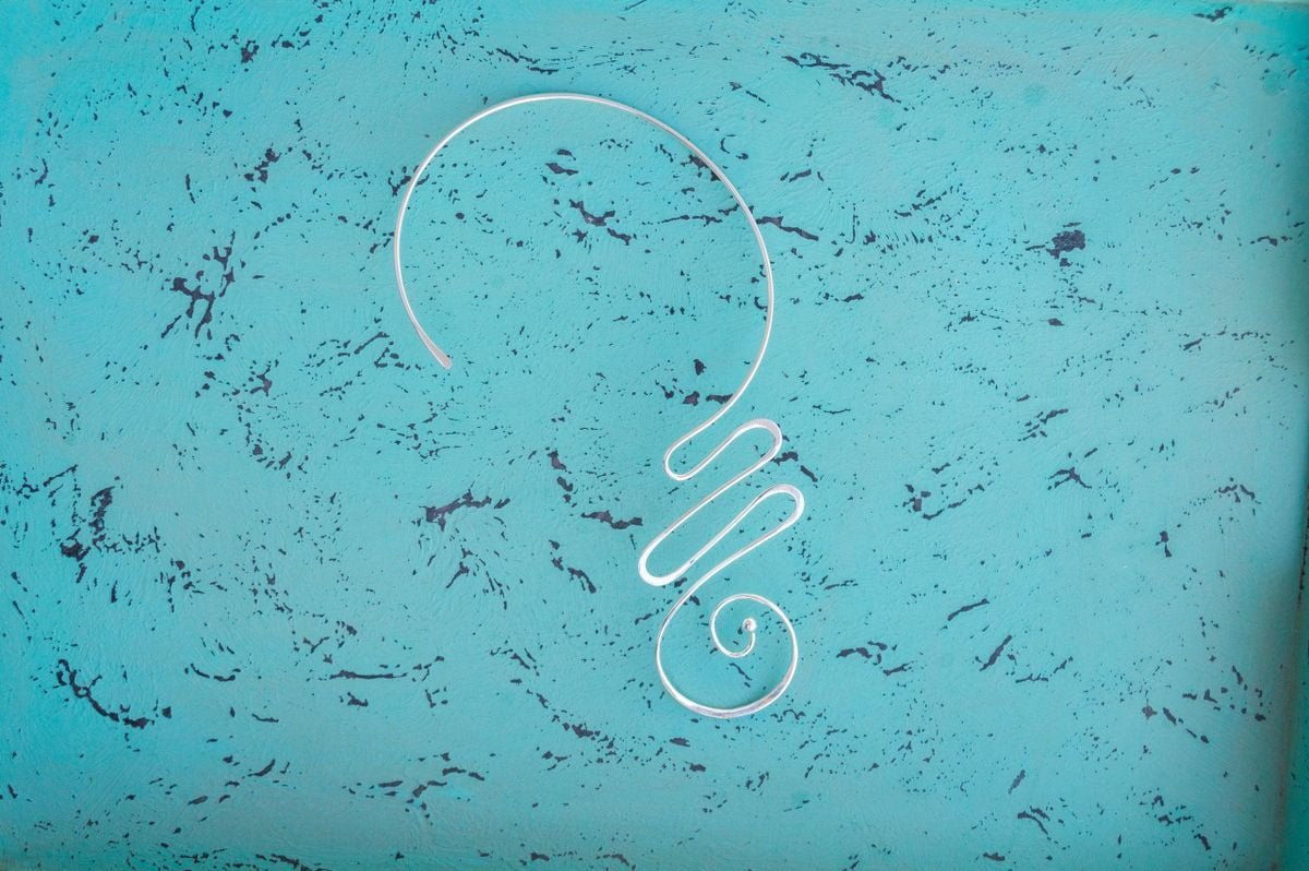 (For visual context, the image displayed shows the neck piece on a textured turquoise backdrop, which accentuates the clean and enticing lines of the piece.)