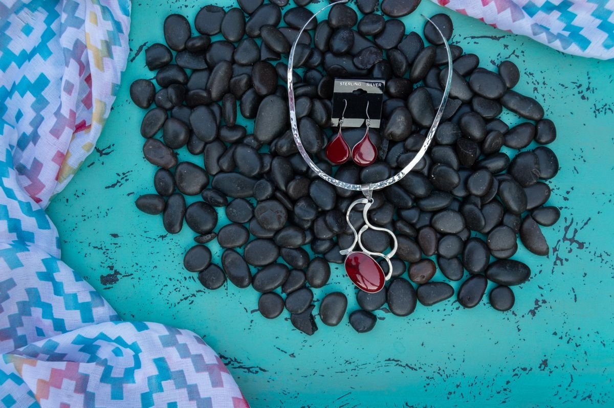 Accompanying the pendant are the large, curved dangle earrings, also fashioned from sterling silver. They echo the design of the pendant with their red jasper stones, enveloping the wearer in a harmonious aesthetic that is both bold and timeless.